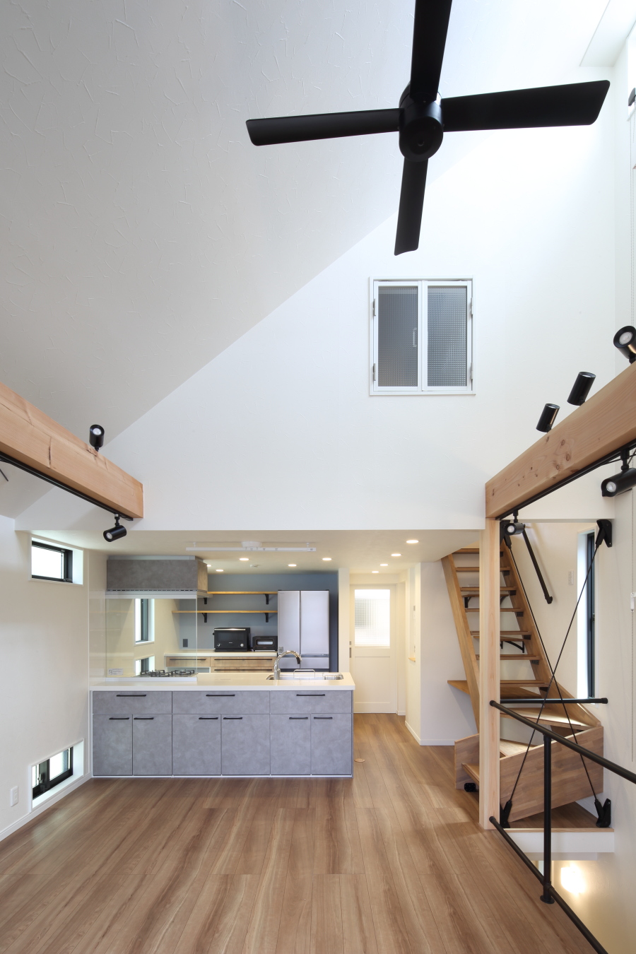 - 木造注文住宅吹抜け高天井リビングの照明ライティングレールスポットライト