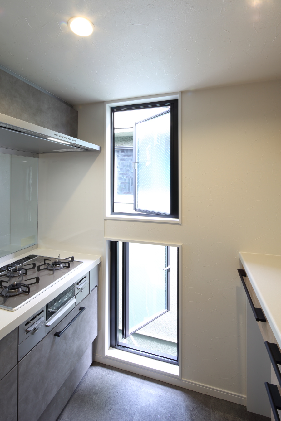 建て主様からいただいたアイデアで、建物外側を通るの風の向きはそのときによって変わるので、ひとつの窓でも窓を上下に分けて、窓の開け方を上下で逆にして、どんな風の向きでも風を取り込めるようにされました。