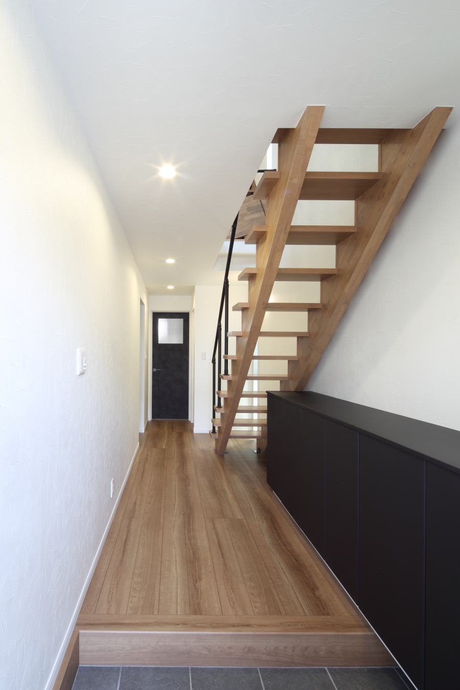 玄関を入ると直ぐに2階に上がる階段が見えます。通路と階段の空間を広く感じられるように、階段の蹴込み板(段板と段板の間をふさぐ垂直の板)を無くして、視線が通るスケルトン階段にしました。