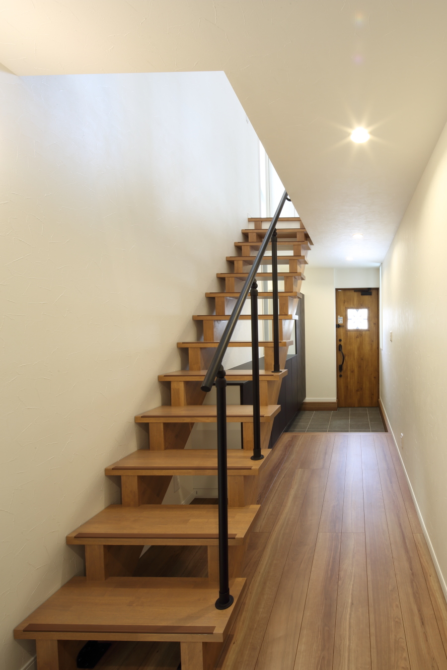 木造2階建狭小住宅の玄関を広く感じるスケルトン階段と手摺