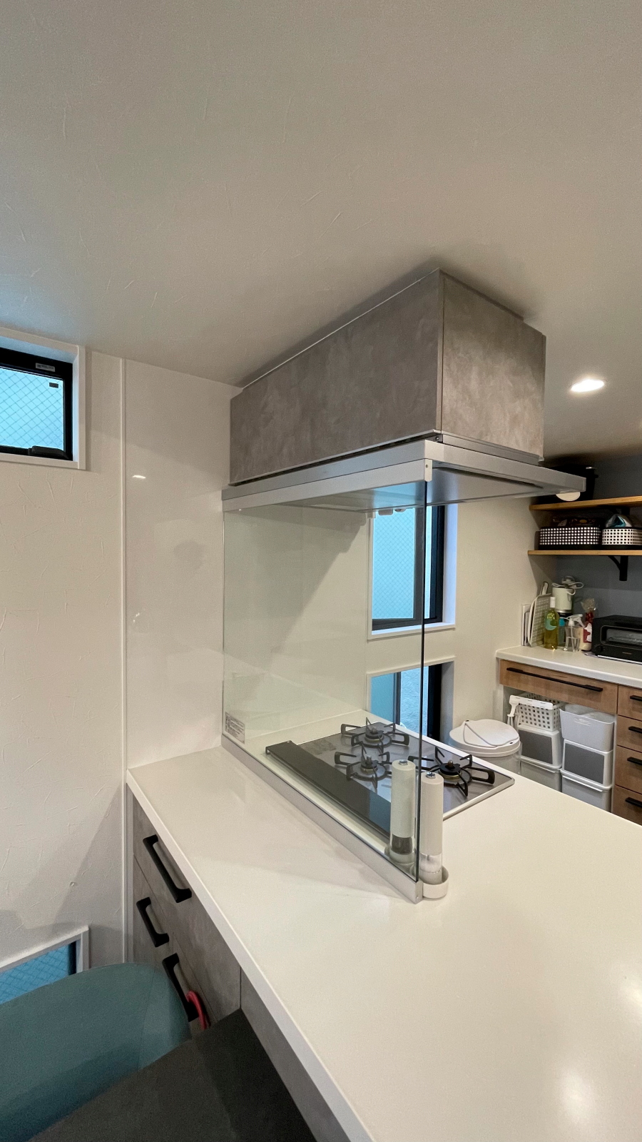 加熱ガスコンロの上側には排気フードが設置されます。ガスコンロで調理するとフライパンやお鍋から液体や油が飛び散ります。それらをダイニングテーブル側に飛ばさないように、ガスコンロのダイニングテーブル側に排気フードから台上までをふさぐガラスが取付けられました。ガラスは耐熱ガラスです。