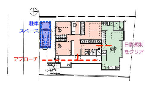 敷地東側を開放してアプローチ空間とし、北側にあるお父様の部屋にも南の光を取り込めるよう主採光窓を計画。二世帯が内部で行き来できるつながりも備えています。