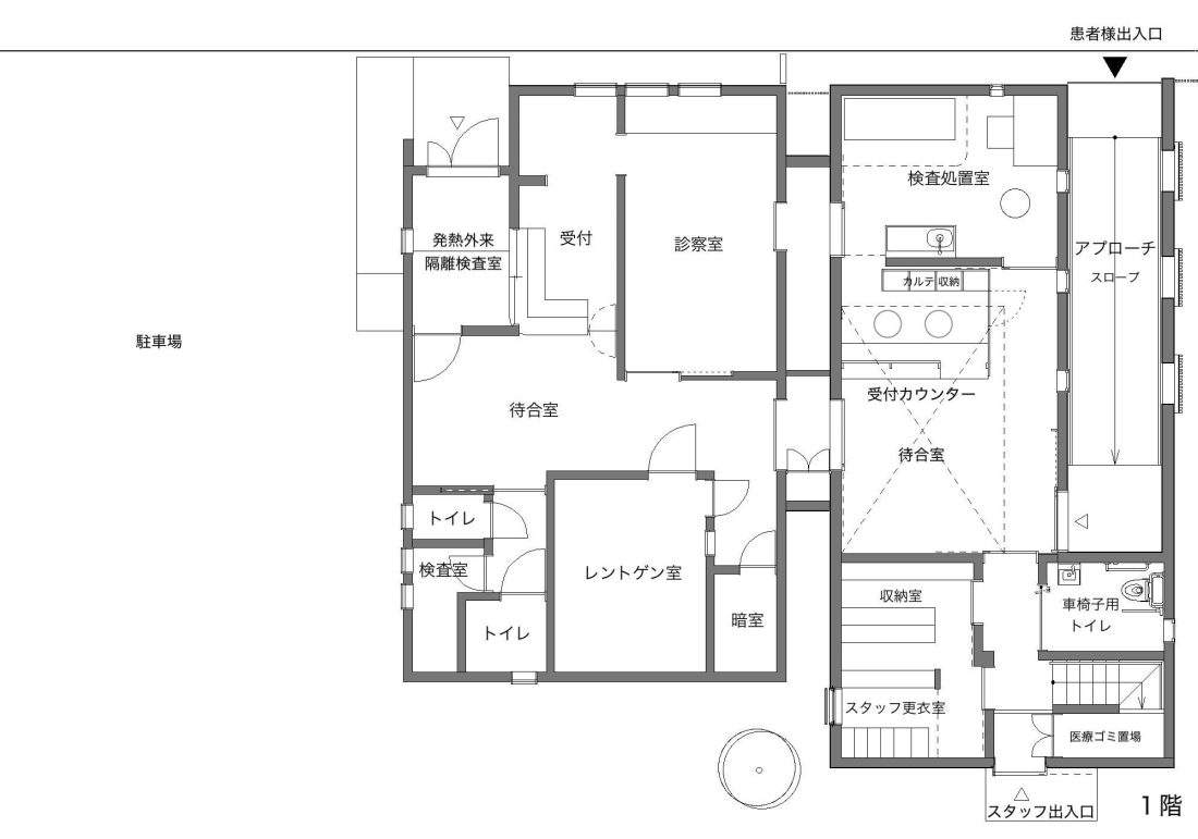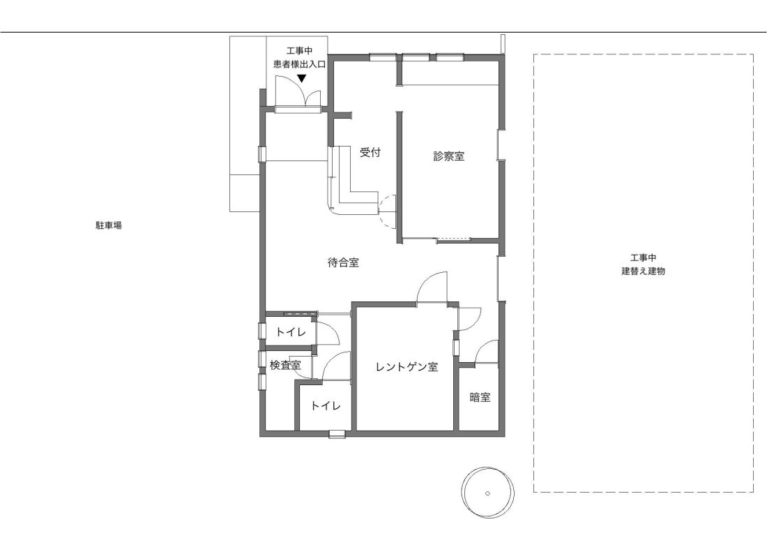 既存医院における発熱患者様をお迎えする検査室は 今回の工事で解体される建物部分に位置していました。建替え工事中の発熱患者様の診療は、診療受付時間を調整して受付することになりました。