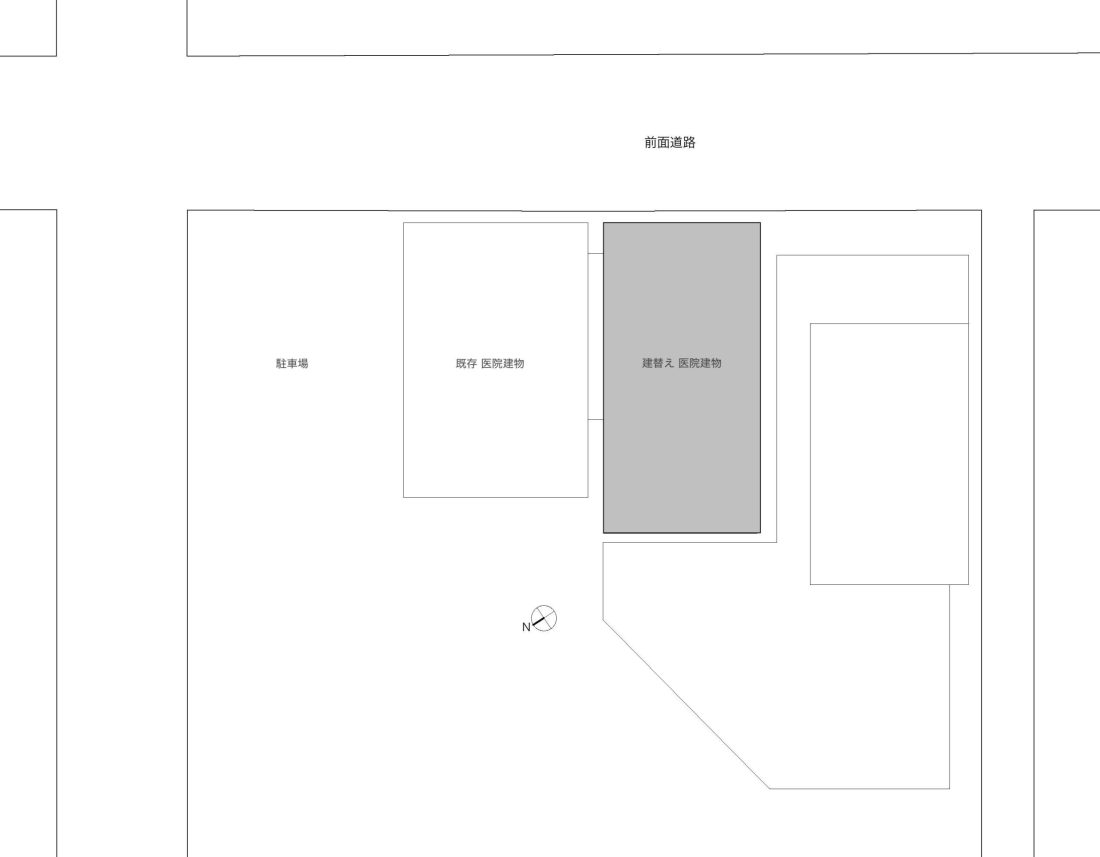 建替え建物は、ご自宅と既存医院に挟まれた位置にあります。この限られた場所に最大限の広さを確保した建物が求められました。