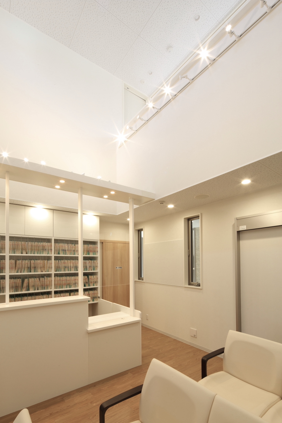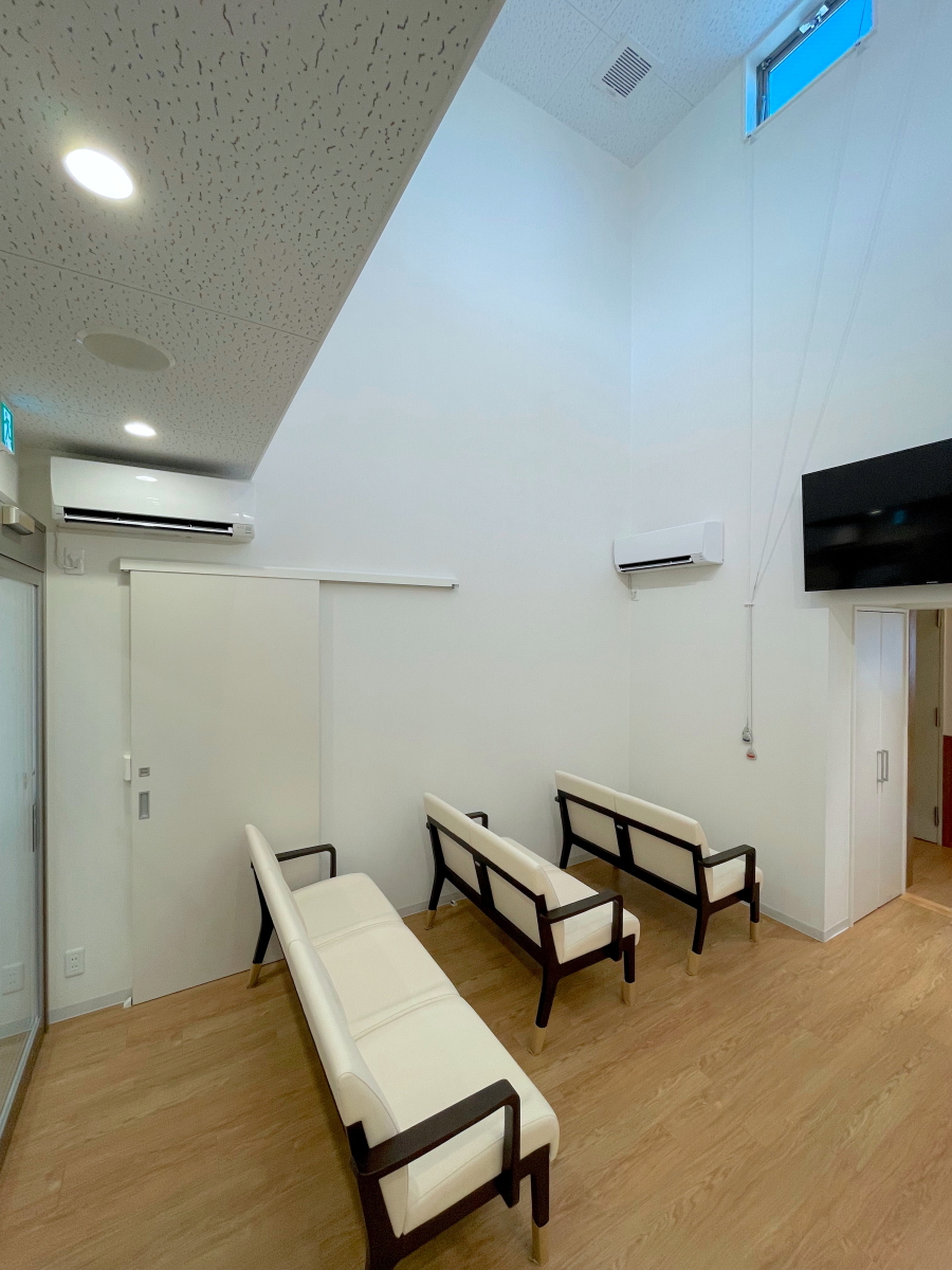 患者様に待合室を広く感じていただくために、待合室の天井を高くして吹抜け空間にしました。面積×高さ=容積 を大きくして、上部への開放感によって患者様と患者様との密度を薄らぐように設えました。
