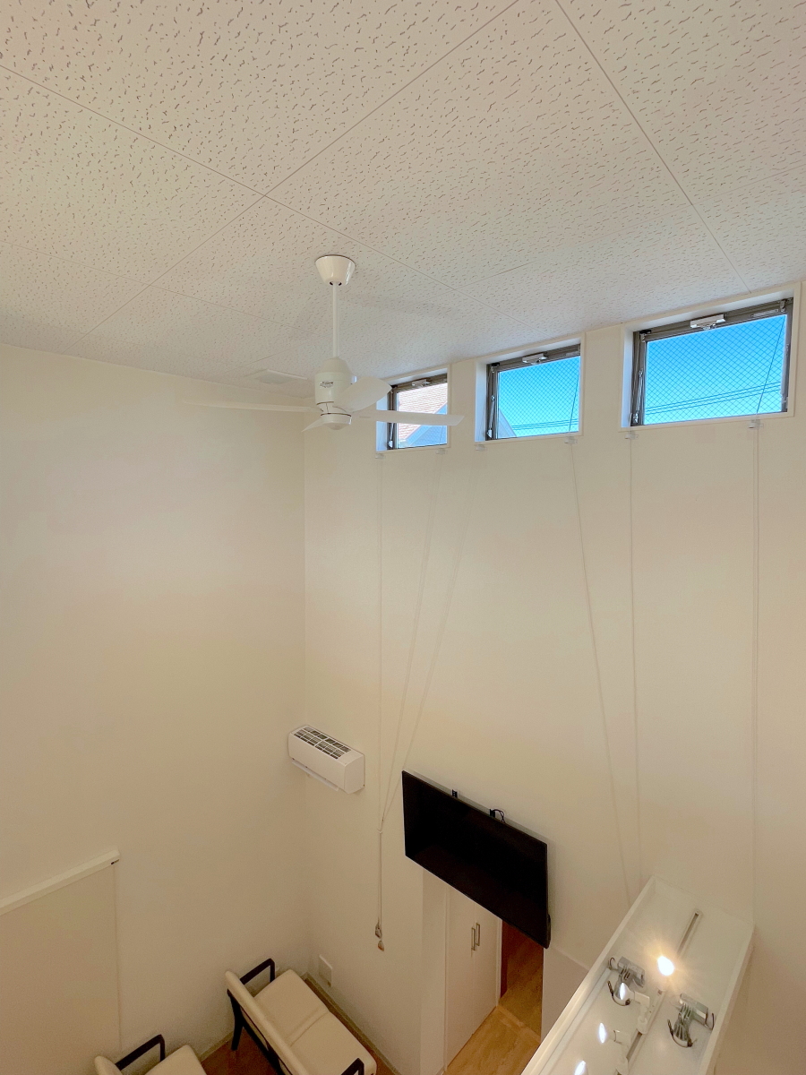 吹抜け空間の上下の空気を循環させるために、上部にファンを設置して空気を循環させました。