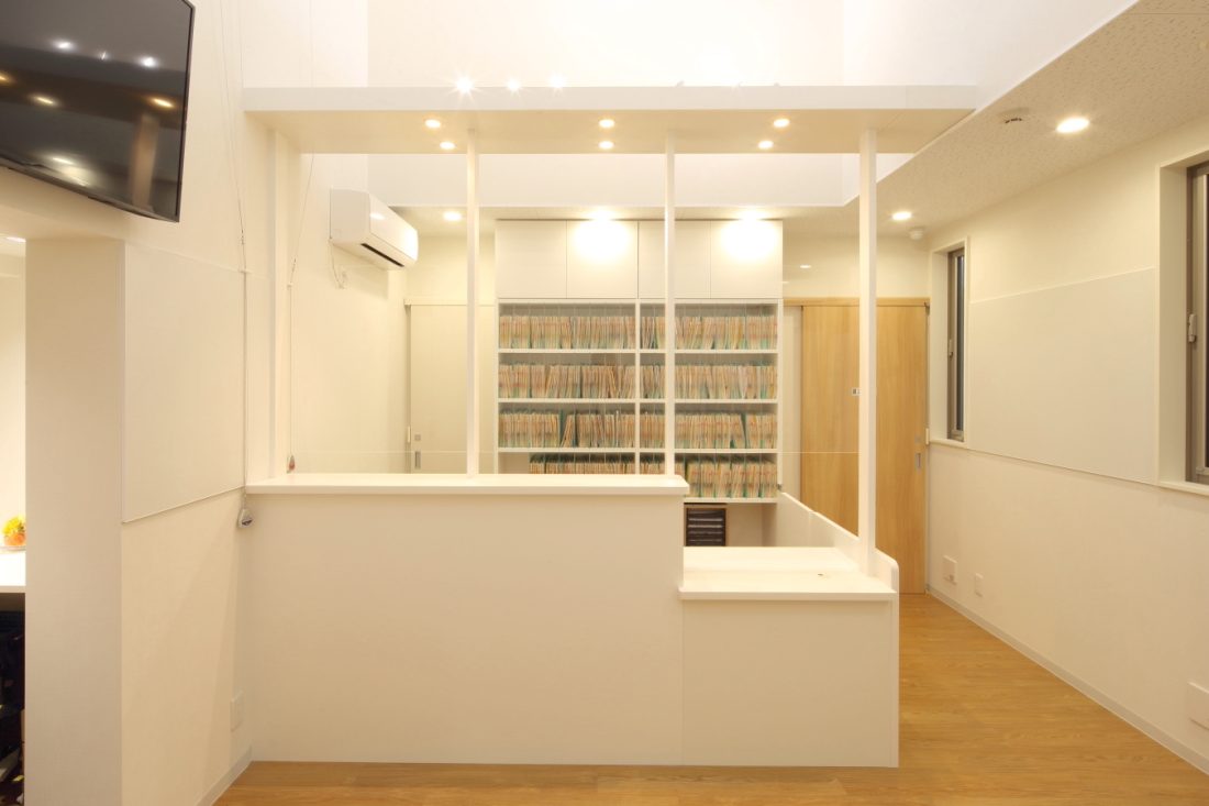 - 小児歯科医院の受付カウンターとカルテ棚を間仕切りに利用する