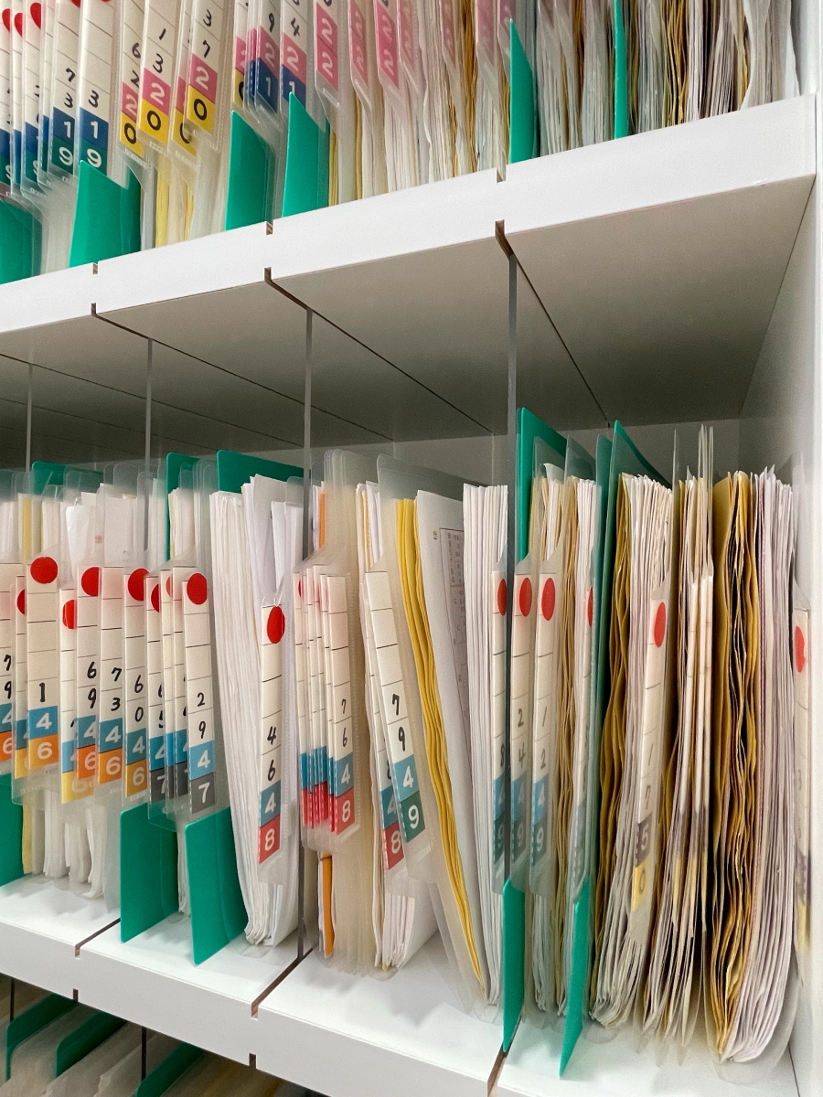 患者様は通常 予約なしで来院されます。出入口扉から入って来られた患者様はまずカウンターで受付していただきます。受付を済まされると背後の椅子でお待ちいただきます。スタッフはすぐに患者様のカルテを探して収納棚から引き出します。