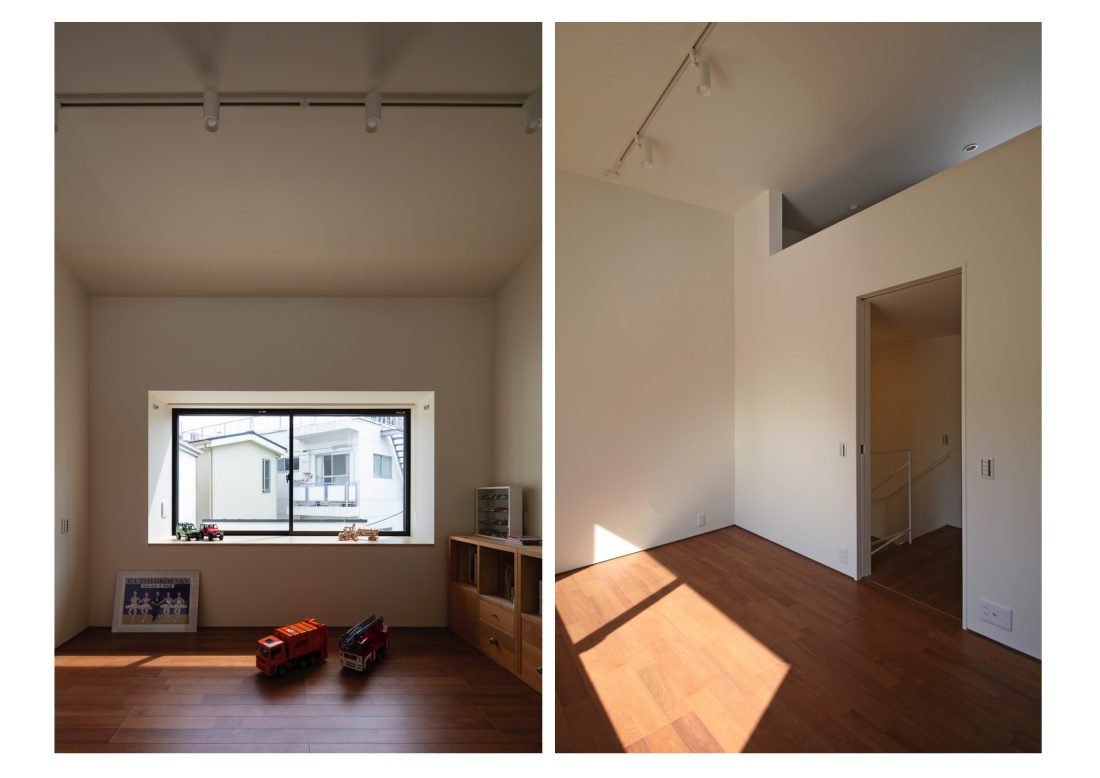 子供室は天井を高く取り、上部を吹き抜けとすることでロフトとゆるやかにつながる構成としました。縦方向の広がりを持たせることで、限られた床面積の中でものびやかさを感じられる空間としています。