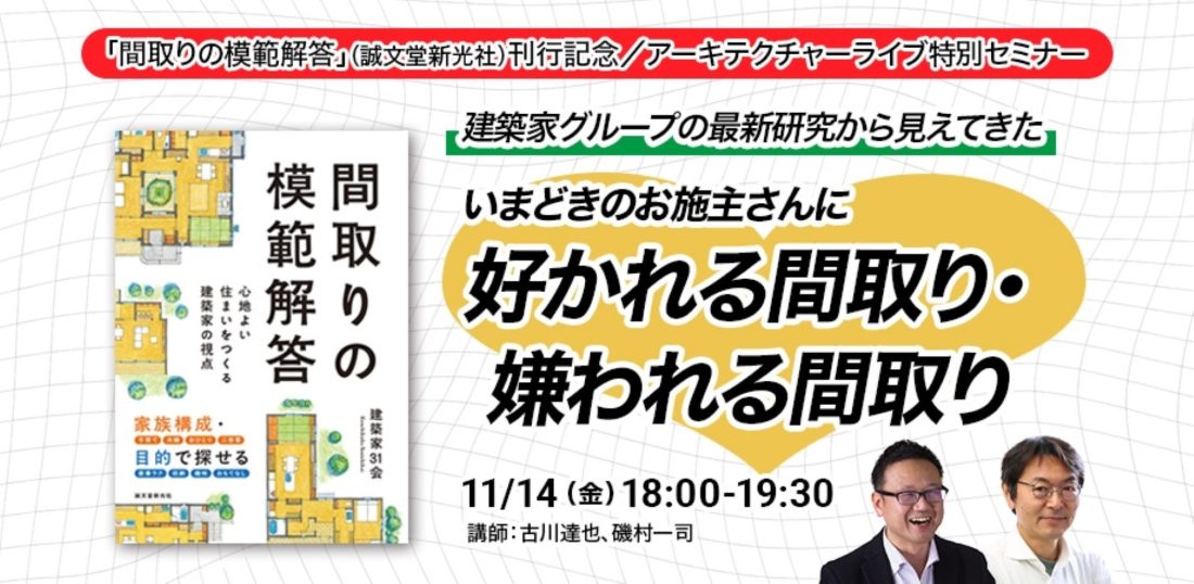 ◆開催内容:『間取りの模範解答』の刊行記念セミナー(無料)テーマ「いまどきのお施主さんに 好かれる間取り・嫌われる間取り」