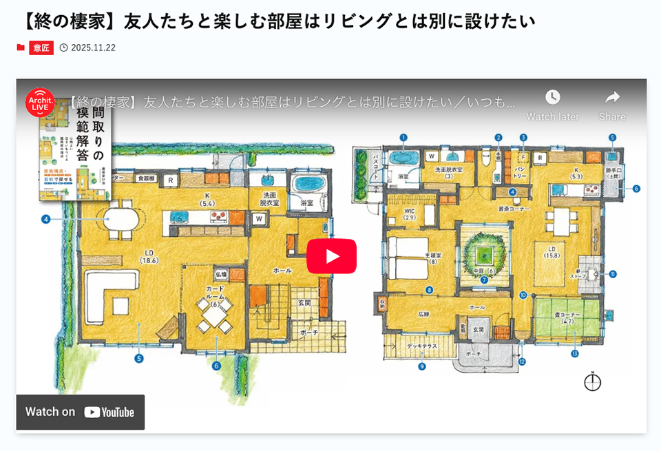 目から鱗のアイデアや間取りを考えるときにヒントが詰まっていますので、ライブを見逃した方、家づくりや間取りに興味のある方は、ぜひ一度ご覧ください。