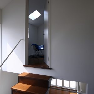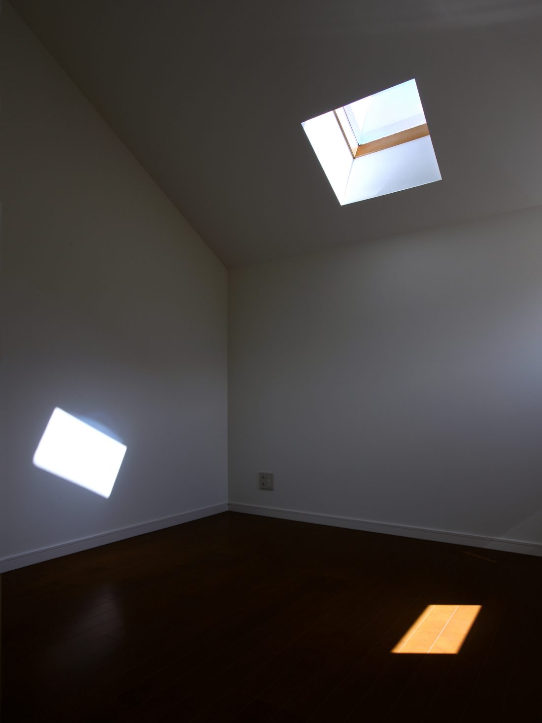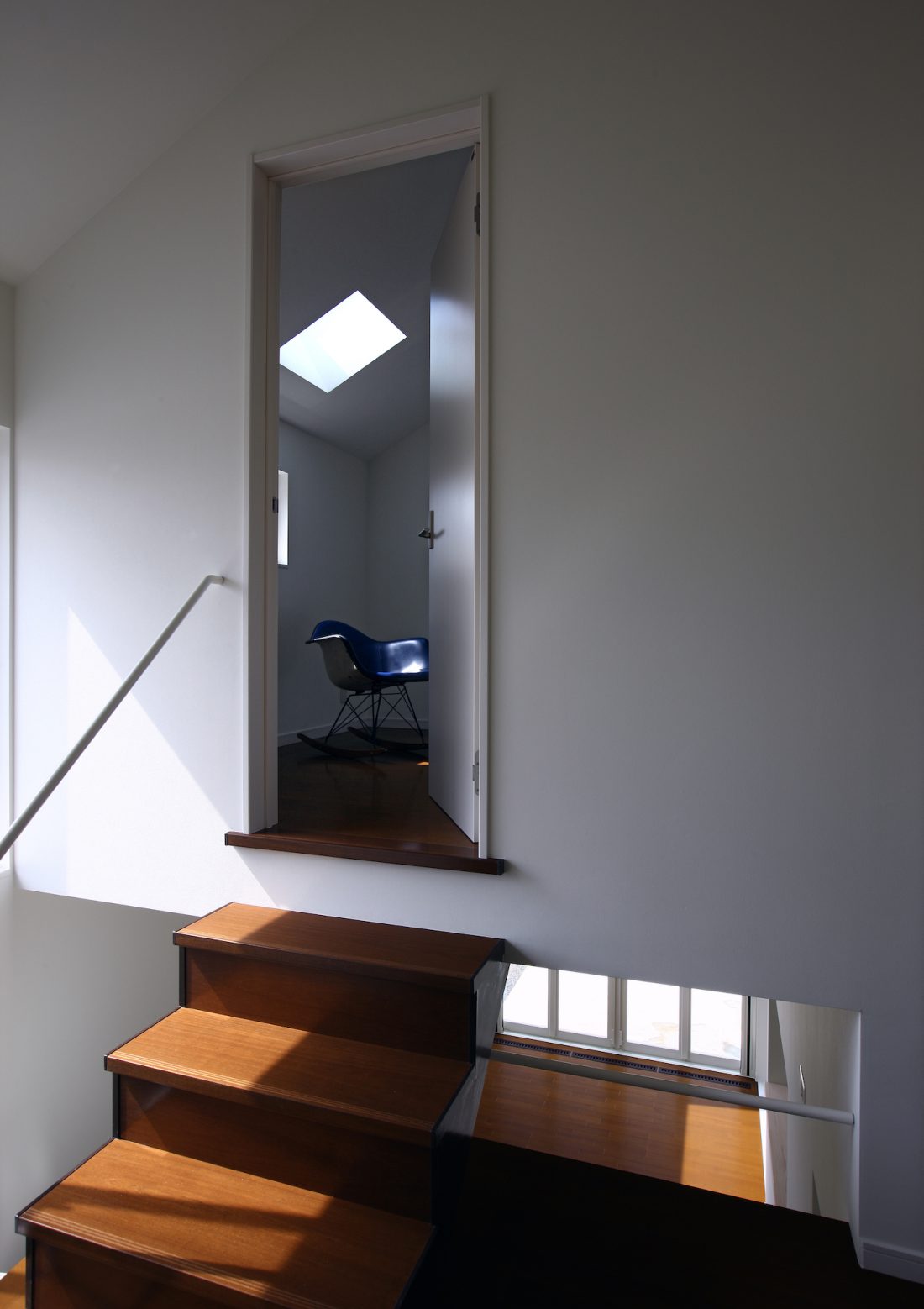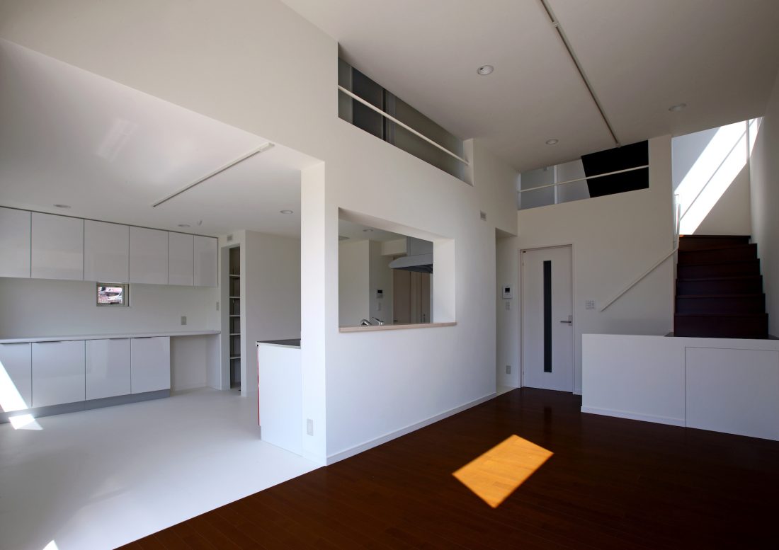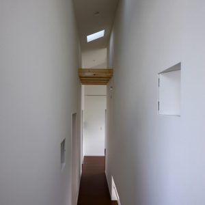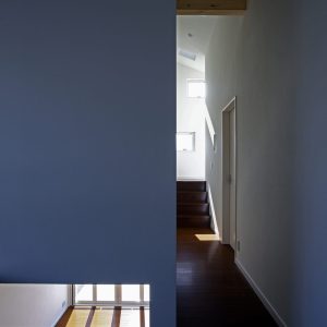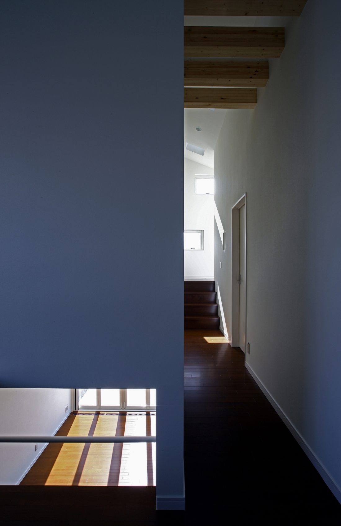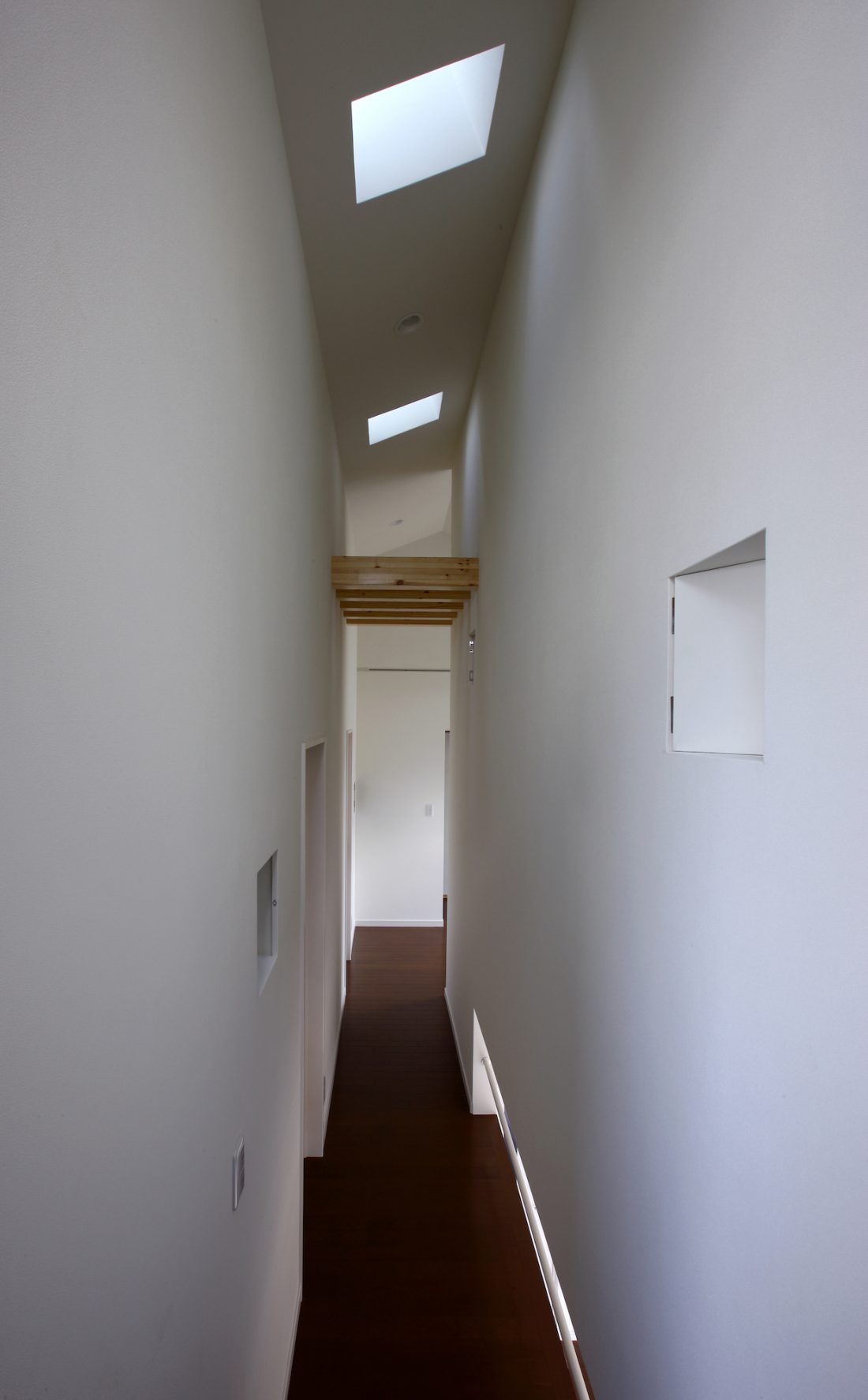 一見閉じた平面構成ですが、廊下の両端に明るいインナーバルコニーとホールを配し、廊下の空間がスキップフロアの隙間に生じた開口によりそのまま1階のリビングと視覚的に結びつけられることにより、不思議な奥行き感が感じられるユニークな空間となりました。