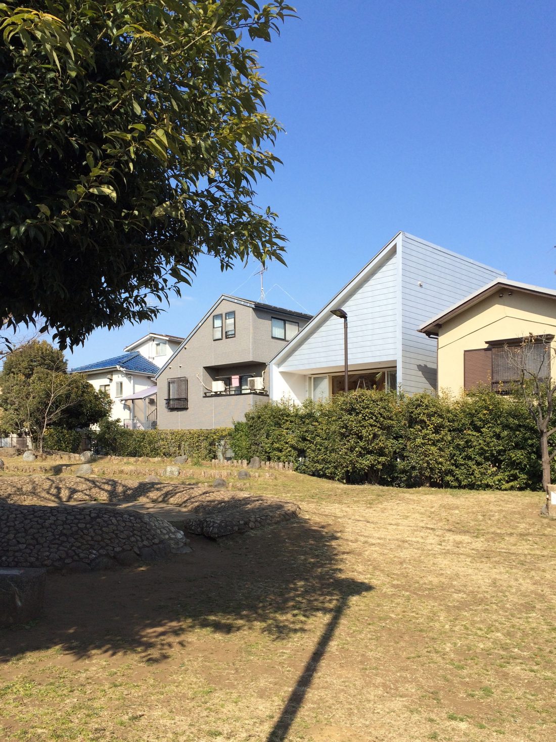 史跡公園は、その周囲を高さ2Mのネットフェンスで取り囲まれていますが、2階レベルからはその存在は一切感じられず、こんもりと繁茂する生垣の上に浮遊する舞台の上に立っているかのように感じられる空間となりました。