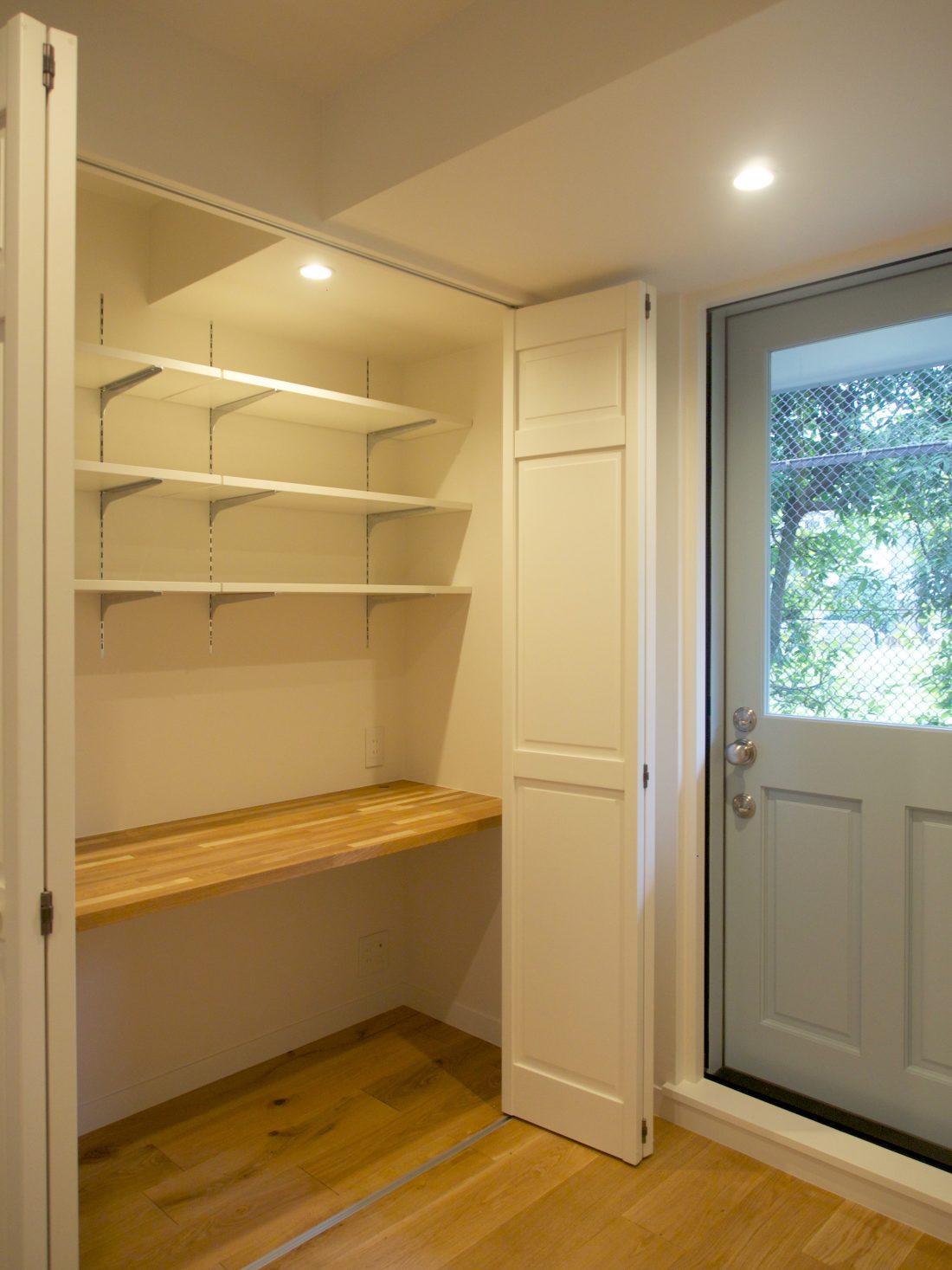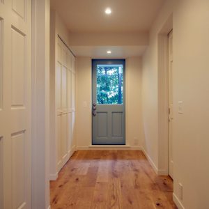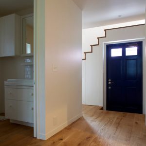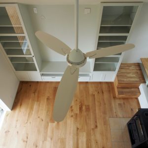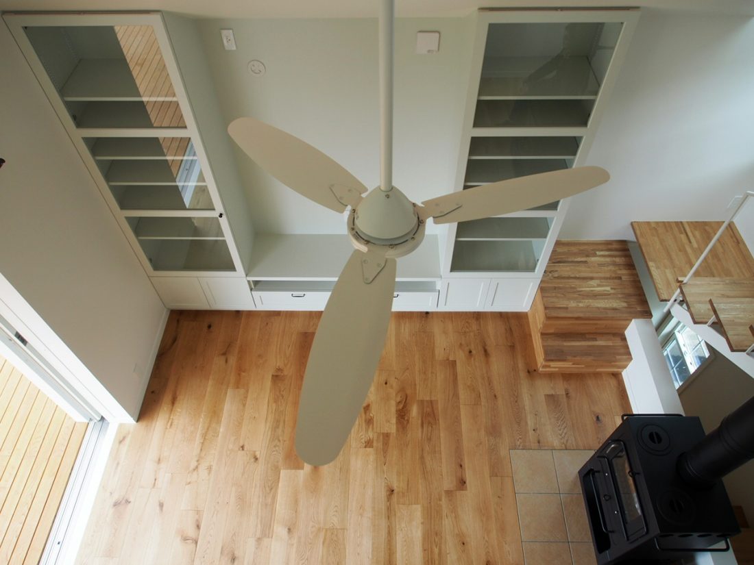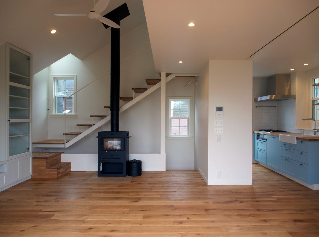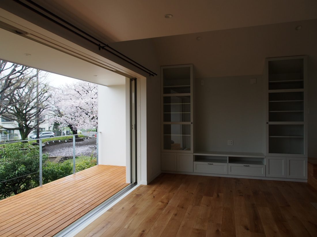 階段や薪ストーブ、キッチンカウンターなど生活のための設えは全て奥に寄せて、LDKのテラス側はワイドな両側引き込み扉とすることにより、視線を遮られることなくLDKのどこからも公園の緑が目に入ってきます。