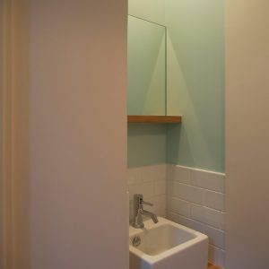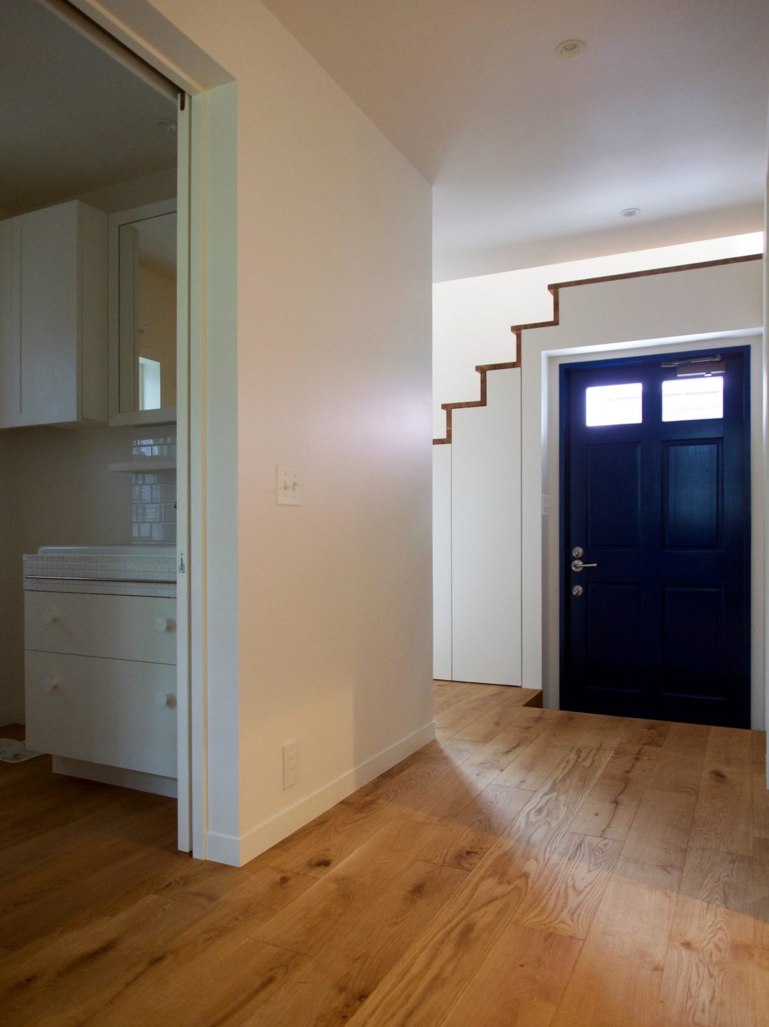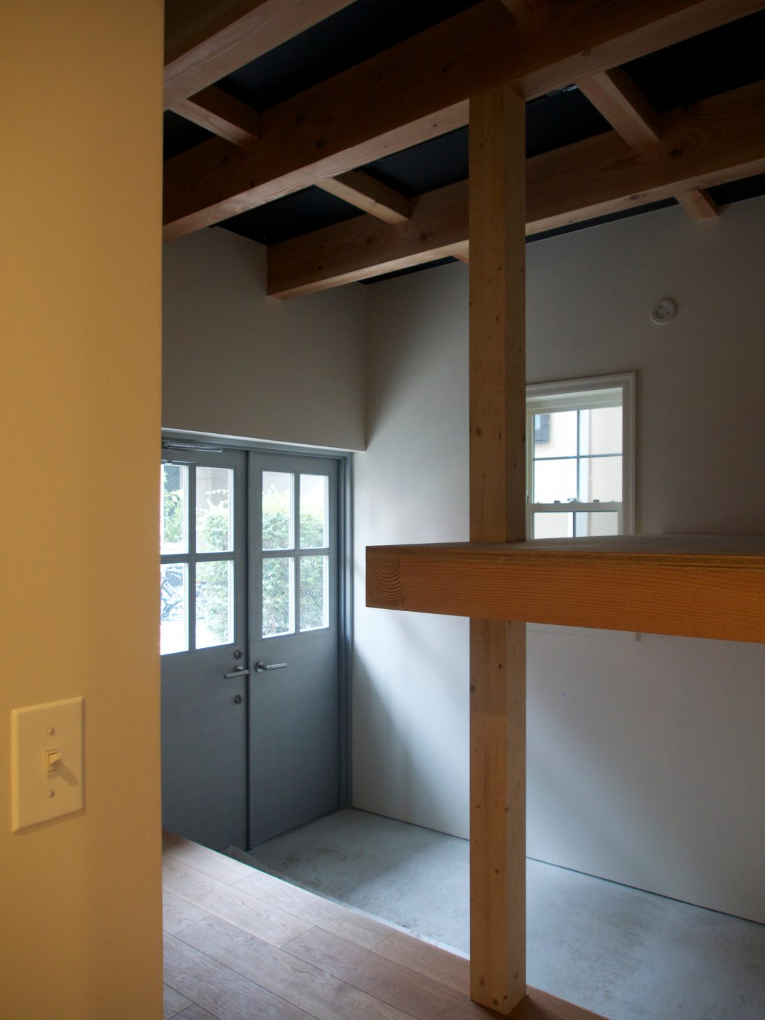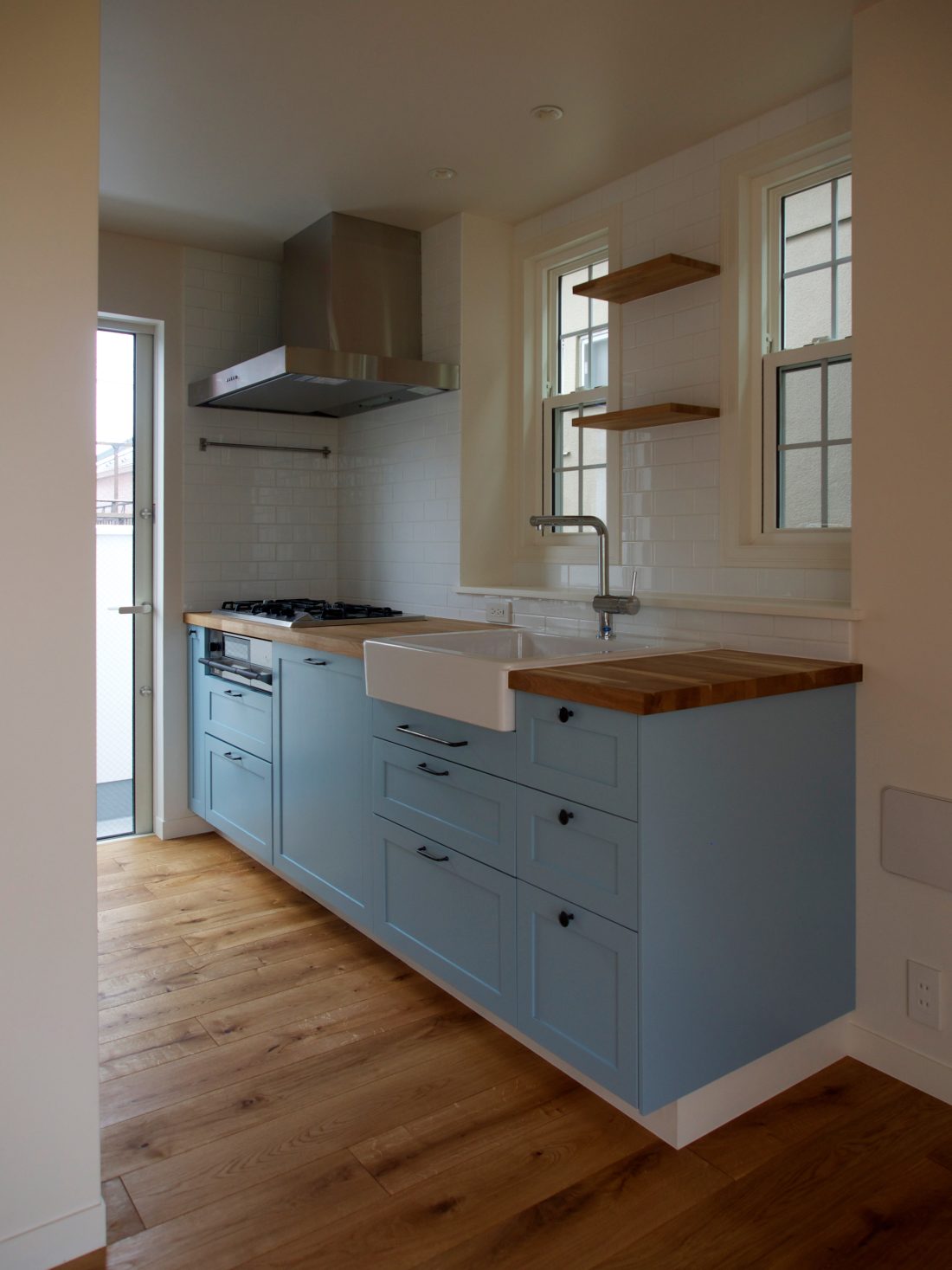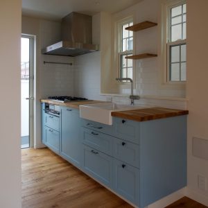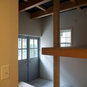 インテリアデザイン、アート、北欧雑貨、バイク、クラシックカーなど、施主の様々な嗜好を反映して、屋根・外壁においては現代のバナキュラーと言えるガルバリウム鋼板素地板の横葺、窓にはクラシカルなデザインの格子窓、内装においてはモールディングや格子扉などを用い、キッチン・リビング収納・洗面台・トイレ手洗いなども特注デザイン家具として製作しましたが、それらのハイブリッドな組合せによりシャープさとクラシック感が良い塩梅にバランスした住宅となりました。