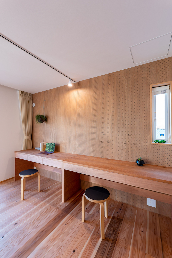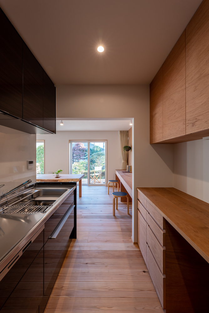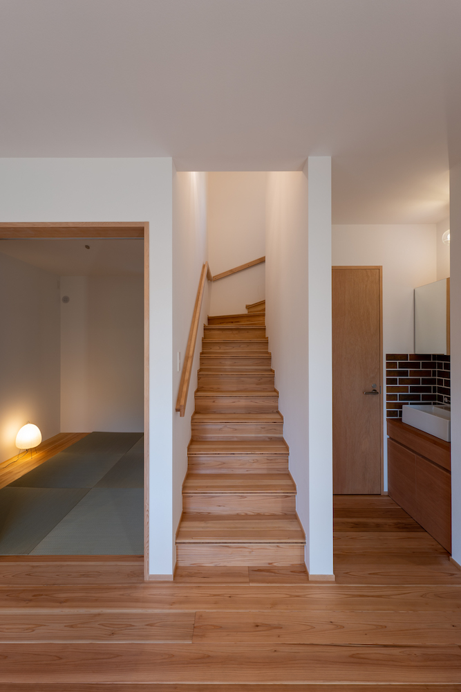 一方、この住まいは楽しい町歩きのように、近道があったり遠まわりしたり、色々な寄り道ができる住空間になるようご家族と楽しみながら設計できました。玄関へ行こうとして庭に寄り道。キッチンに行こうとしてスタディコーナーに寄り道。2階へ上がる前にゴロ寝で和室に寄り道など、何かへ向かう途中で寄り道したくなる感覚を大切にした住まいです。室内物干し部屋も、寄り道空間として洗濯物を干したりたたんだり、家族が互いに自然と平等に協力し合い、家事に関わり易くする空間になりました。