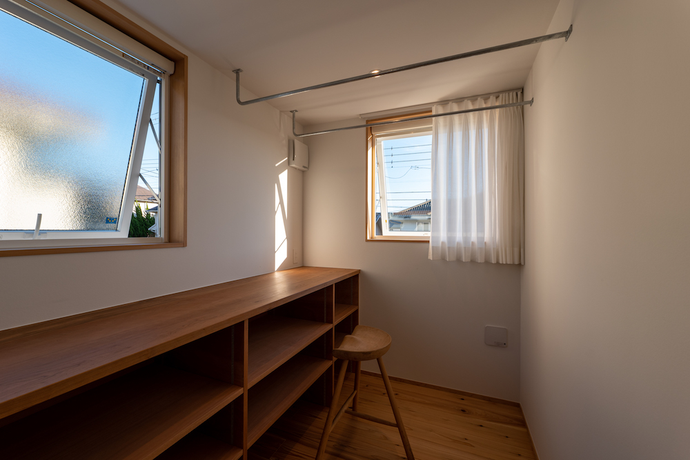 いわゆるサンルーム的なガラス張りの空間でなく一見ふつうの個室です。というのも、室内干しの部屋に求められる条件は、風が通り抜けていくために必要な2カ所以上の窓、花粉が飛ぶ時期は窓を閉めても湿気が排出される給気口と排気口(換気扇)だけなので。洗濯機や乾燥機が置ける広々としたランドリールームもいいですが、この住まいのような小さな物干し部屋でも役目はきちんと果たしてくれます。タオルや下着などの収納棚とアイロンがけのできるカウンターは、実際に凄く便利でおすすめです。