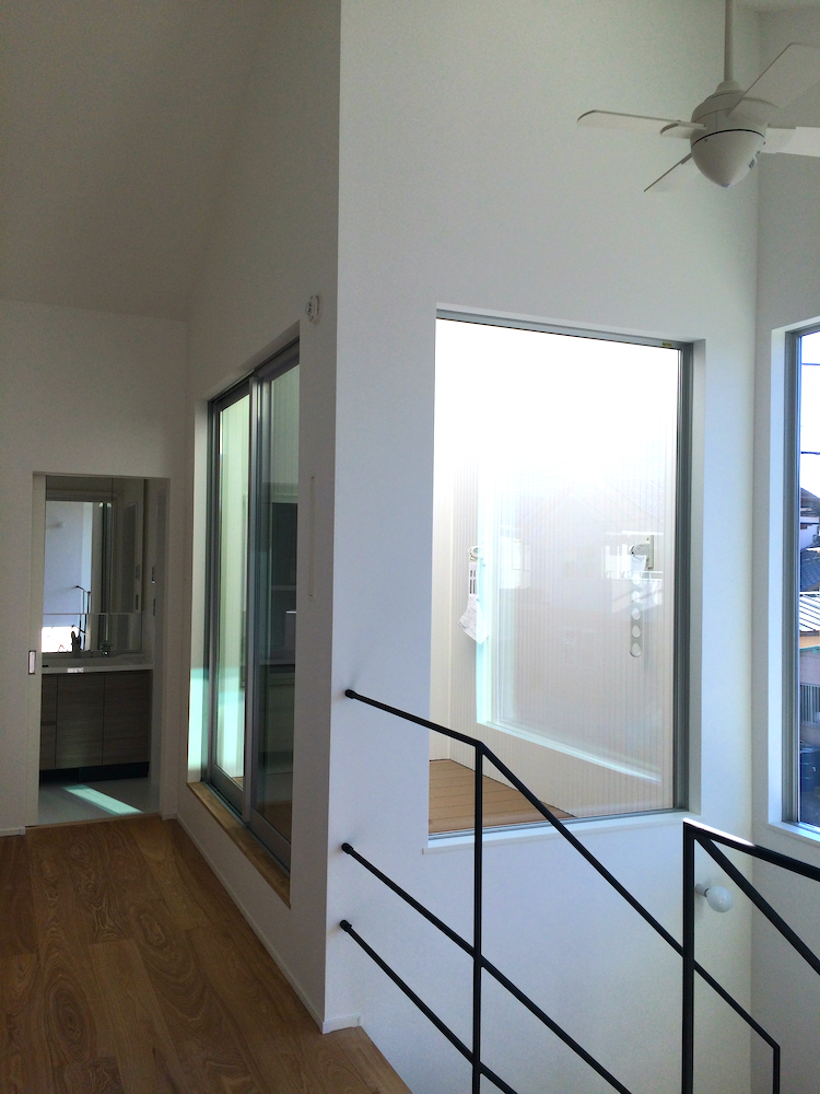奥に洗面室、ガラスで囲まれたところが物干しテラス。