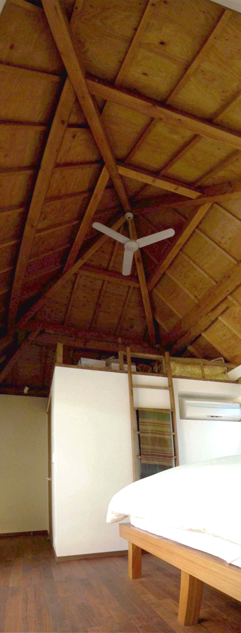 こういった演出によってハナレ空間は、特別なデザイン”バリ風”としても違和感がなくなり、かつ「非日常」を感じてもらいやすくなります。壁には珪藻土を使用したり、床材も熱帯系の樹種を採用し、ベッドも通常よりも脚を高くし、振り切ったデザインとしました。