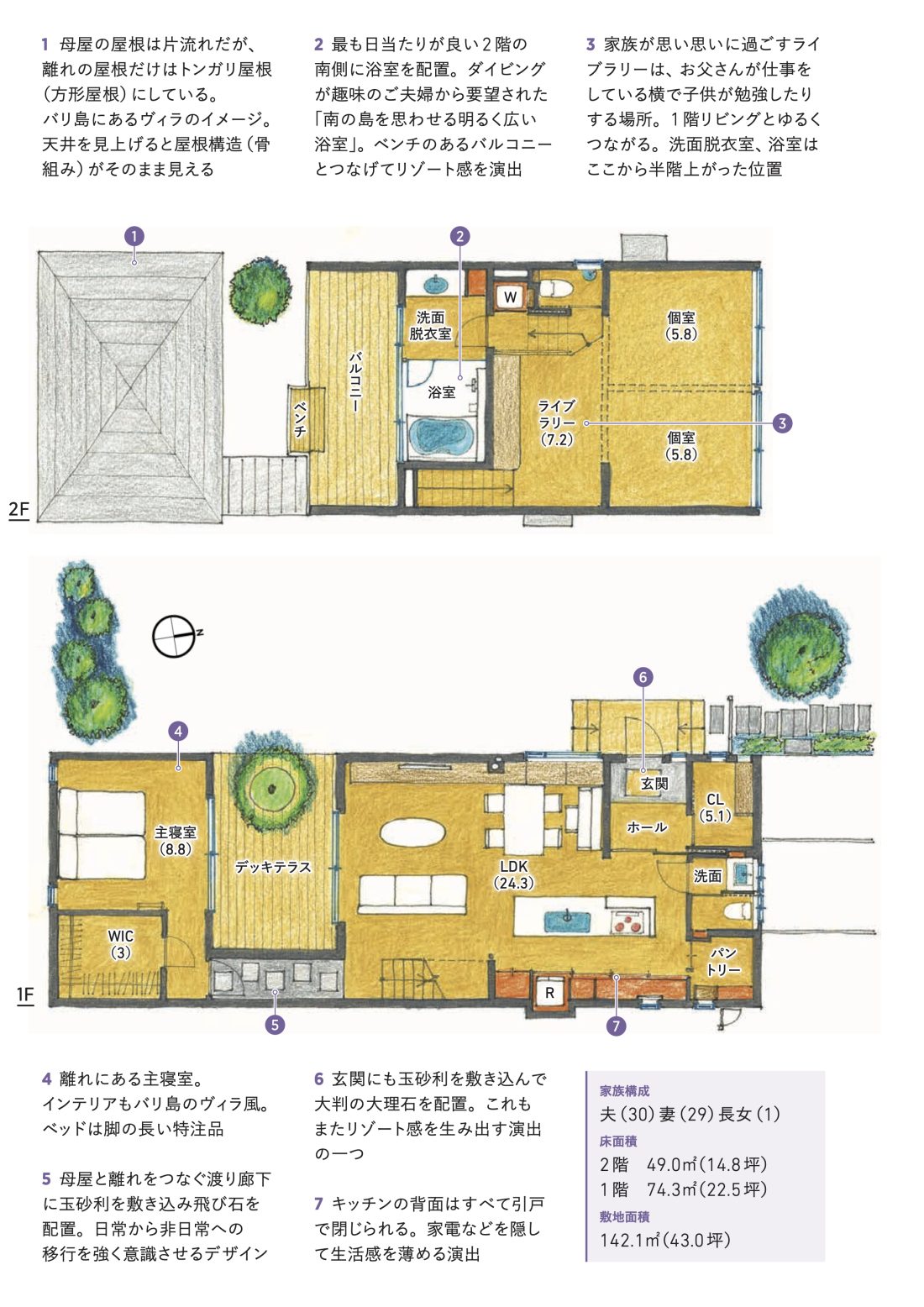 機能的でシンプルな間取りの中にリゾート感をちりばめたり、思い切った「ハナレ」によってより深くリゾートに浸ることで、結果的にメリハリの効いた間取りが出来上がりました。