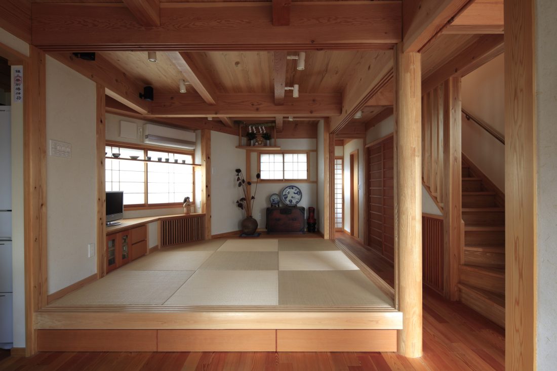 ①リビングは伊藤園のお茶殻をリサイクルした畳です。ダイニングから30cm上がっていますので、腰掛けるのにもちょうど良い高さです。下は大きな引き出し収納になっています。